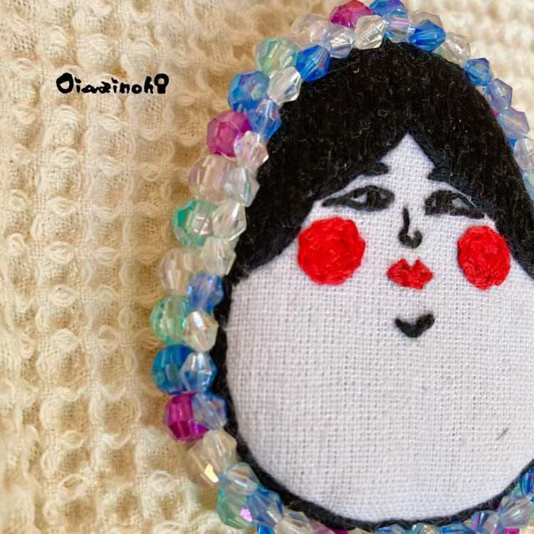 お多福さんの顔は手刺繍で表現され、周りをキラキラとしたビーズで飾って一層華やかな印象に仕上げました。