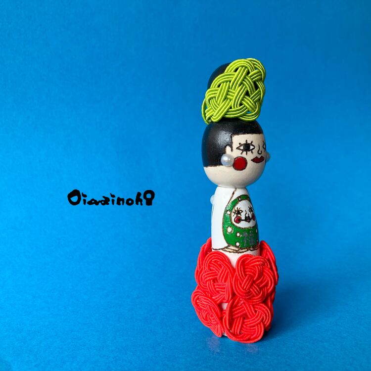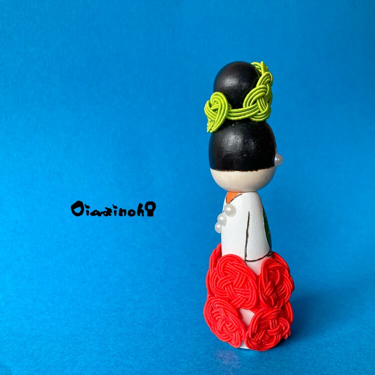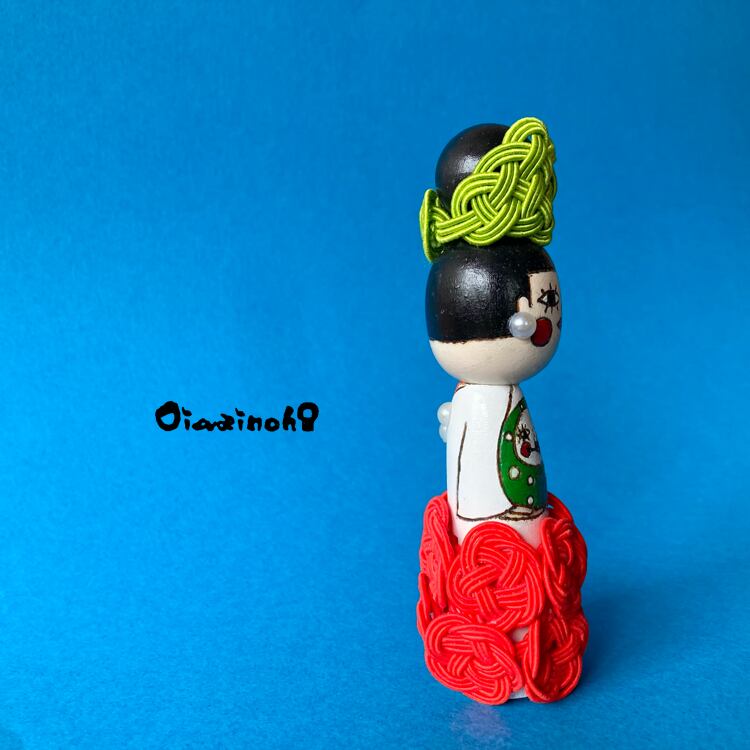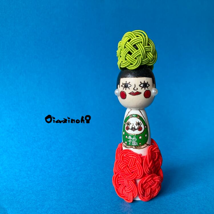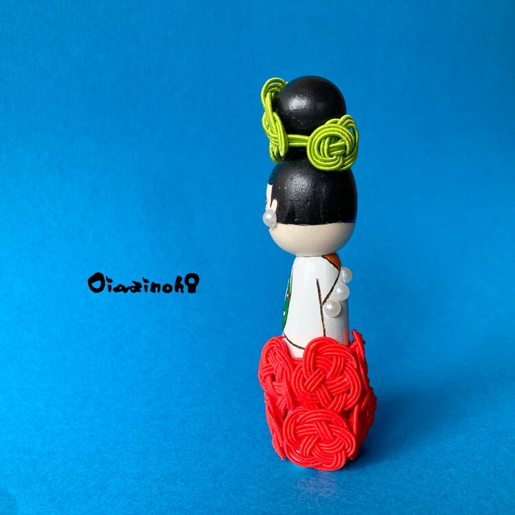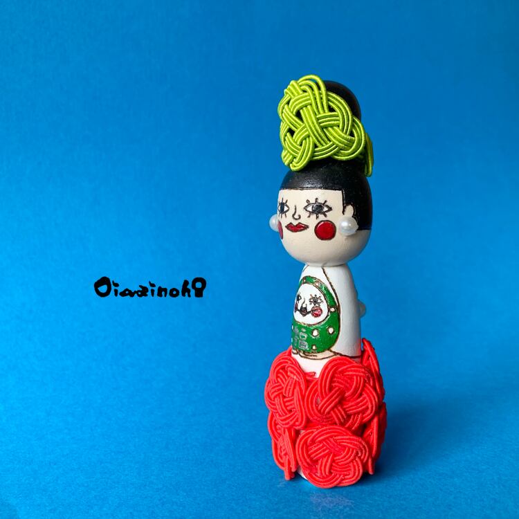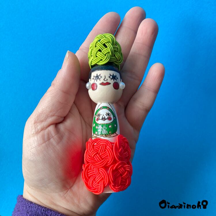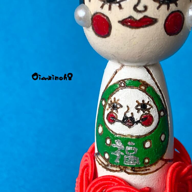 ちびっこけし娘さんが、水引で作られた松の髪飾りを着け、梅スカートを履いて、そして色鮮やかなだるまさんを抱いて、縁起物という縁起物を身に着けちゃいました。