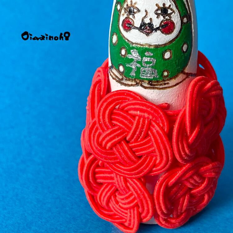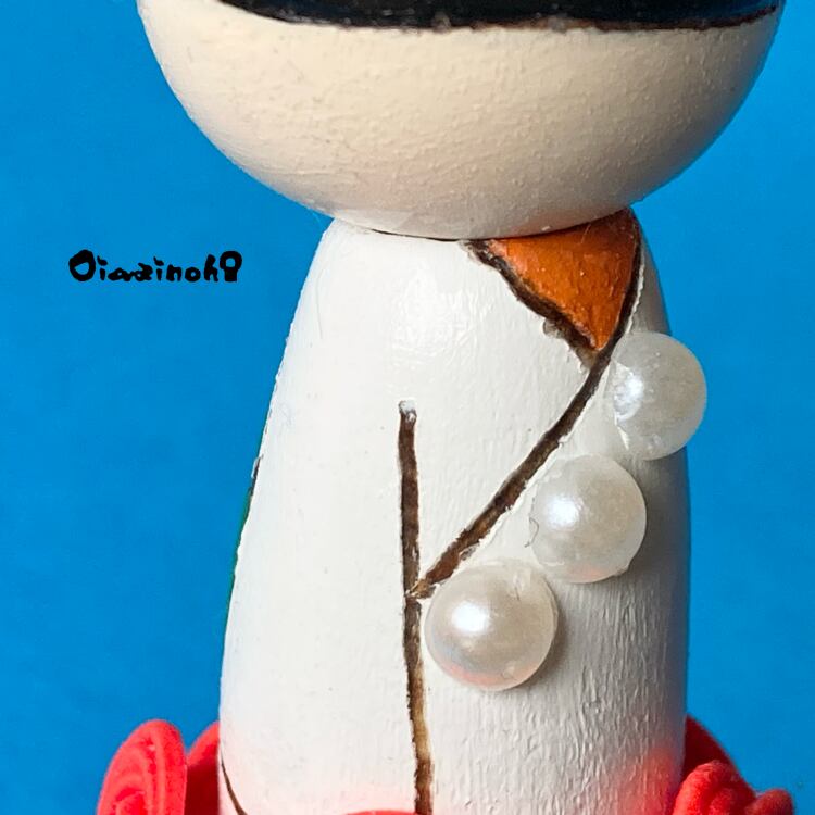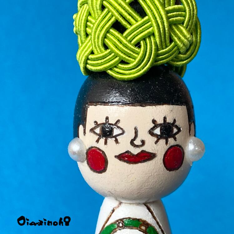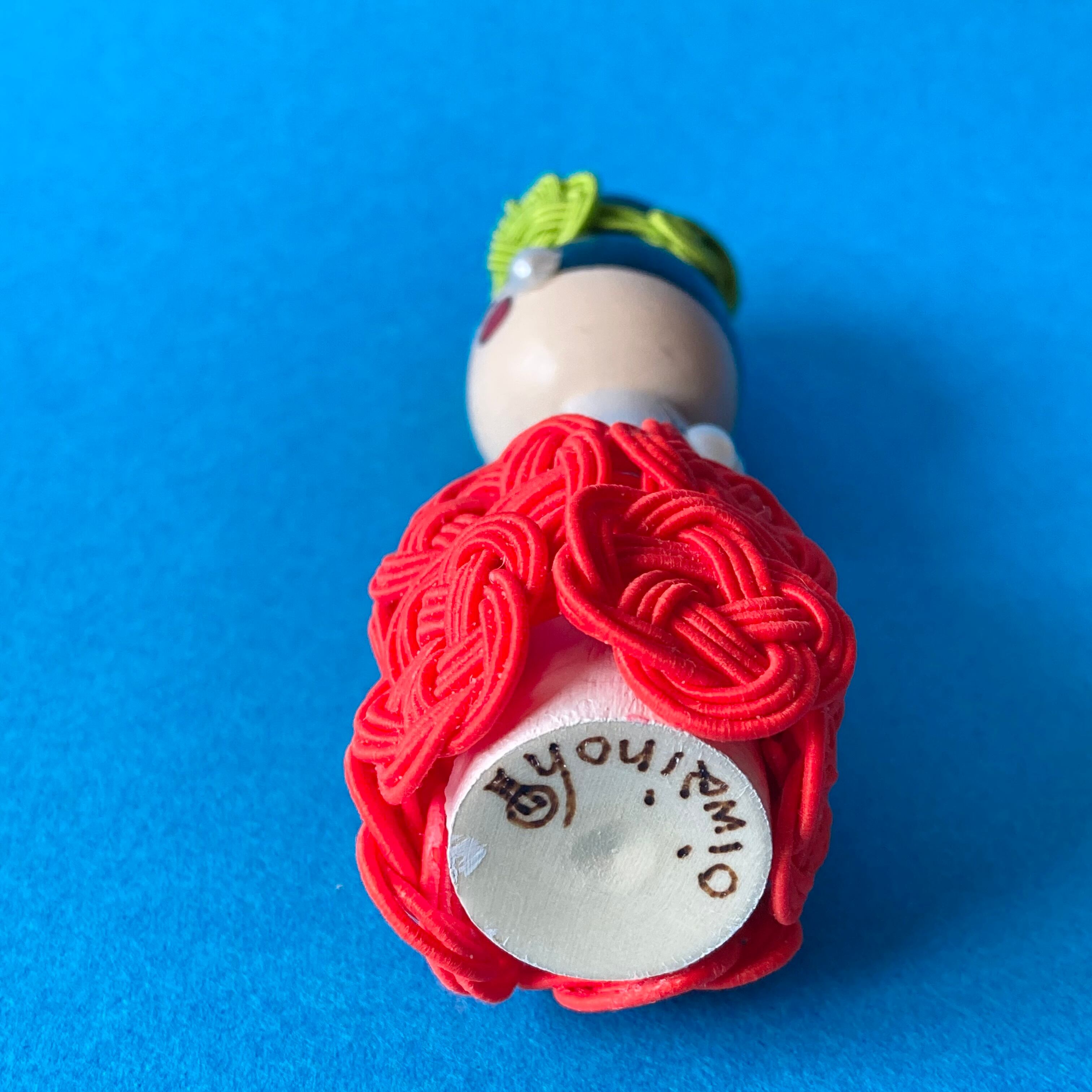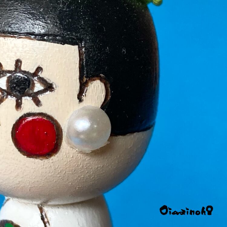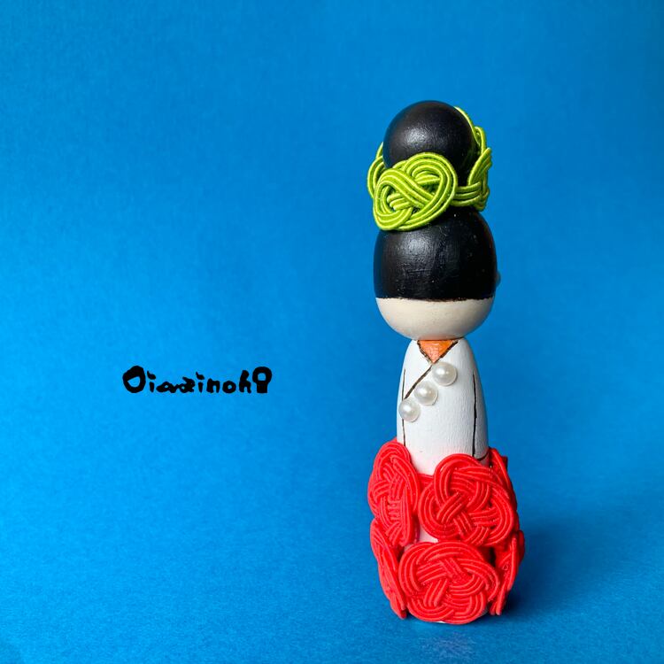 ちびっこけし娘さんが、水引で作られた松の髪飾りを着け、梅スカートを履いて、そして色鮮やかなだるまさんを抱いて、縁起物という縁起物を身に着けちゃいました。