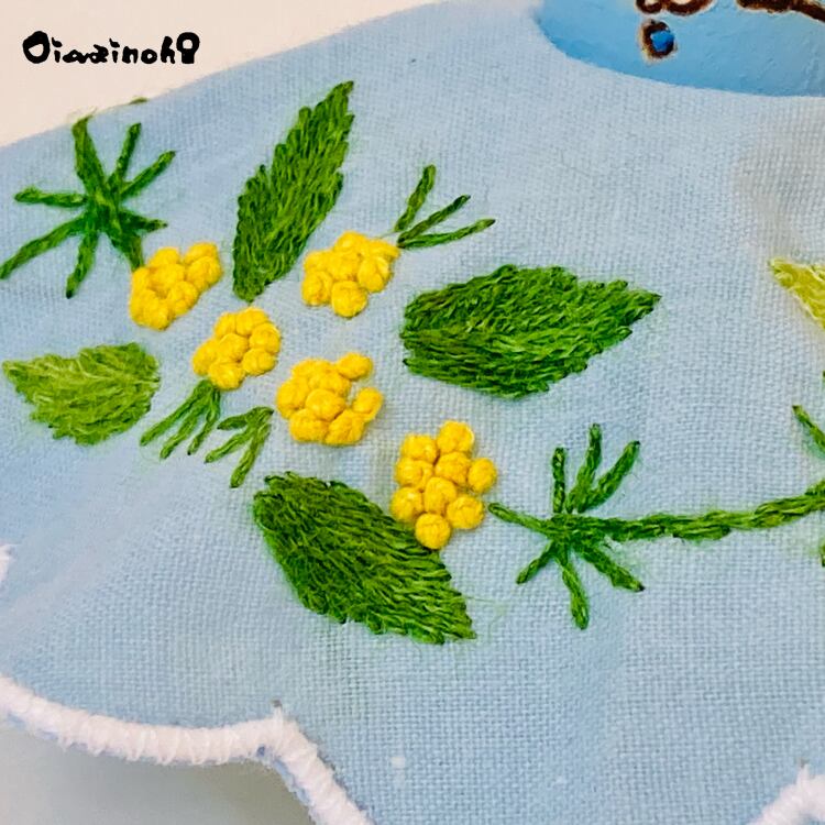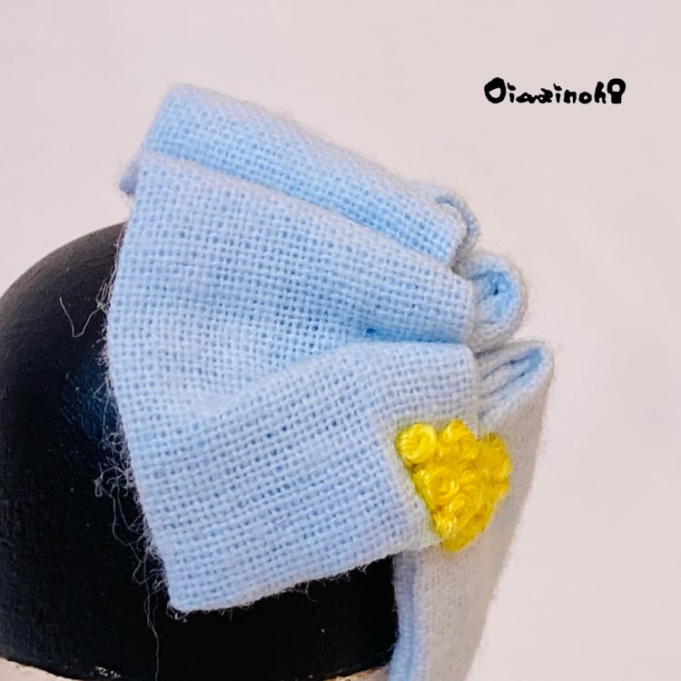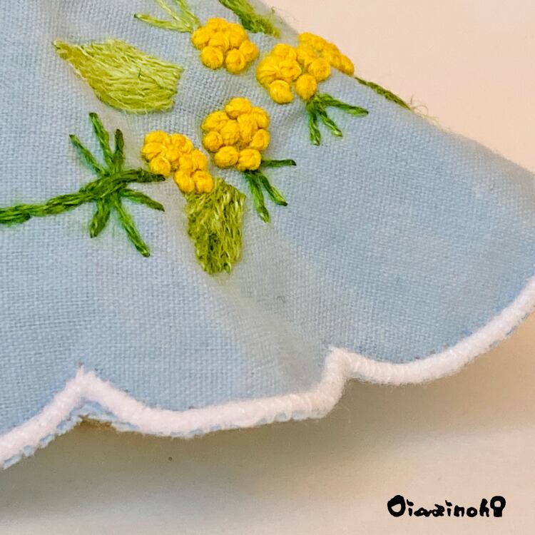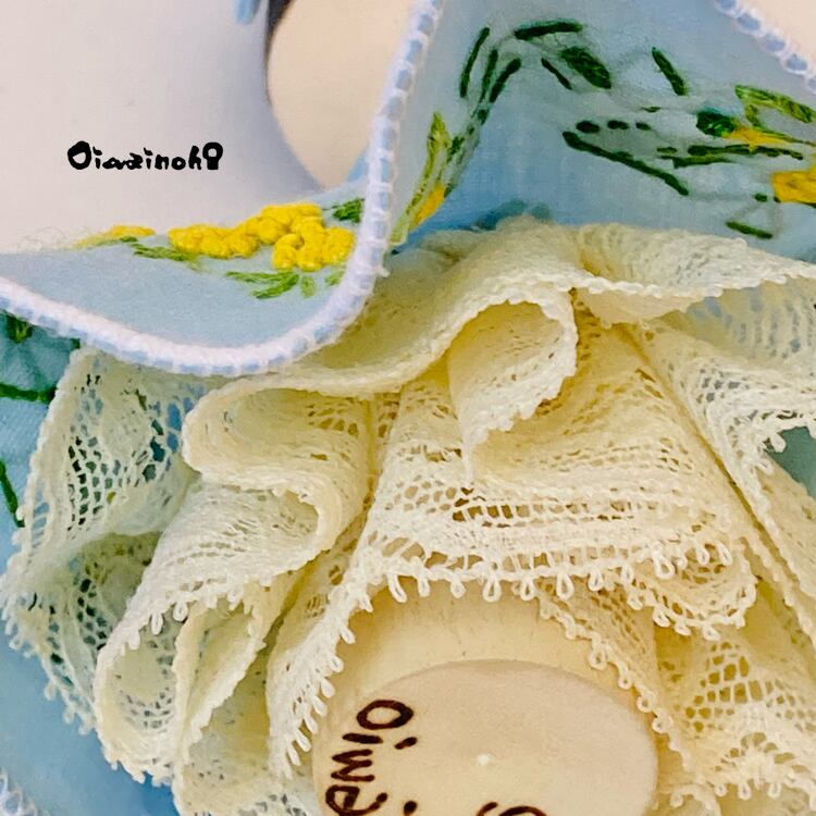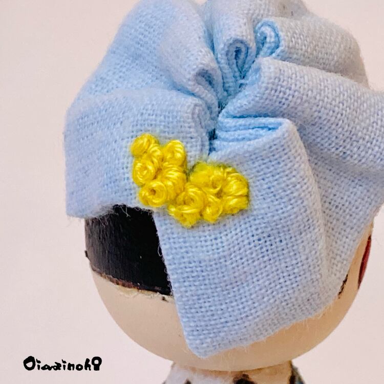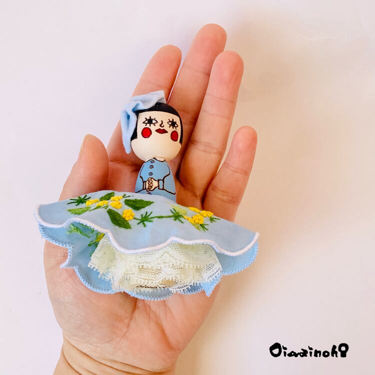 このちびっこけし娘さんは、可愛らしいミモザの刺繍が施されたドレスをまとった、春色プリンセス。