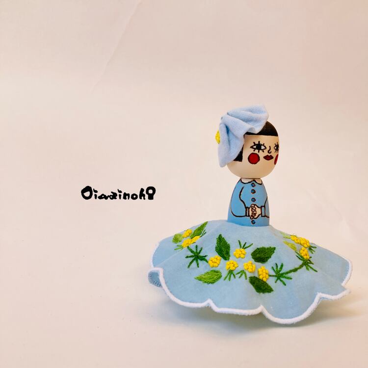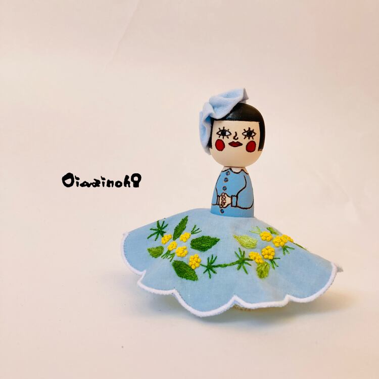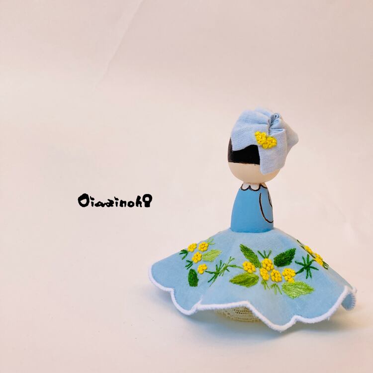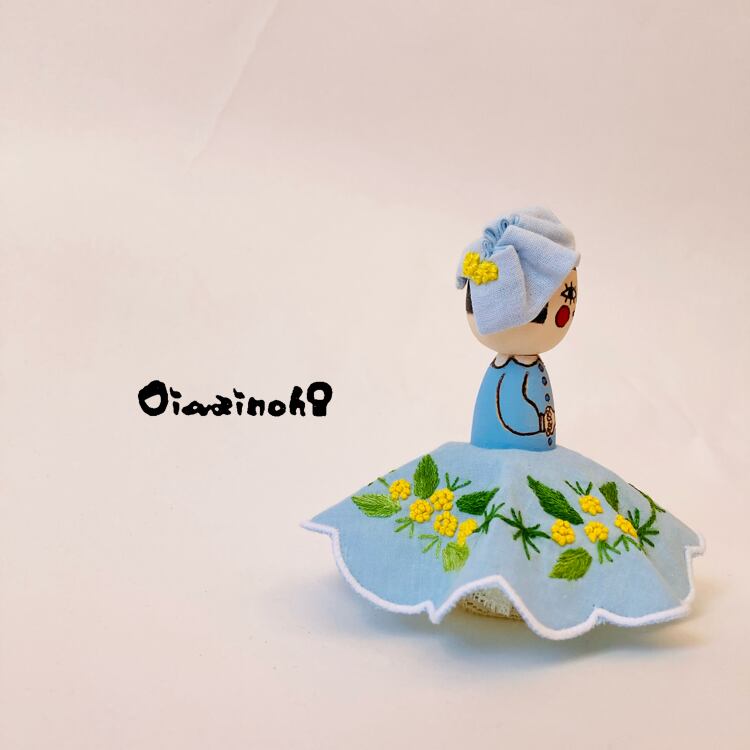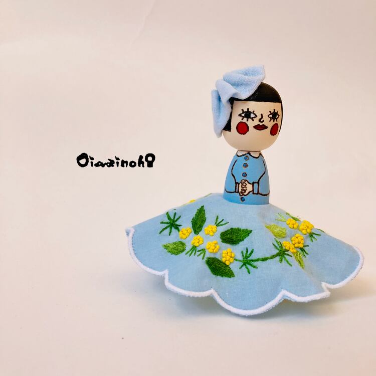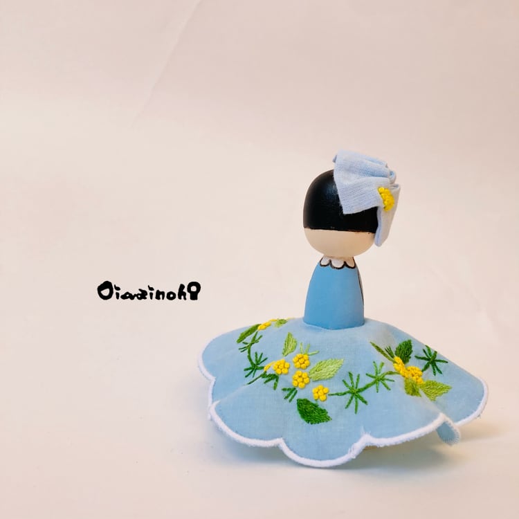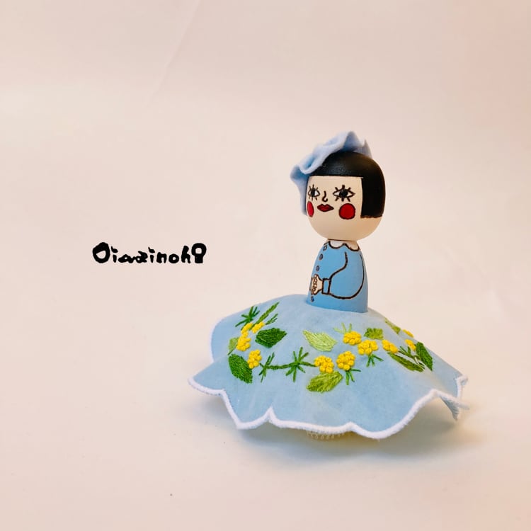 This little Kokeshi daughter is a spring-colored princess in an embroidered dress with a lovely mimosa motif.