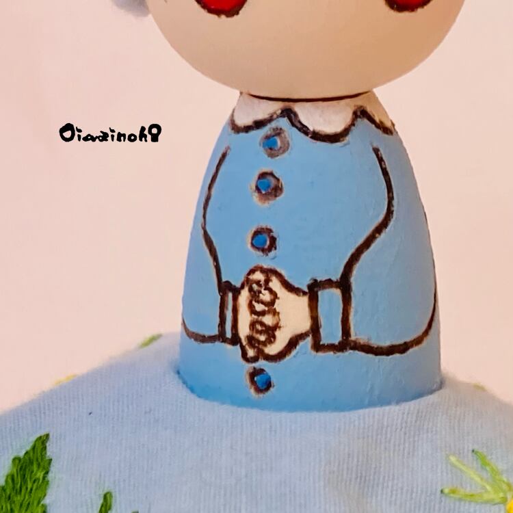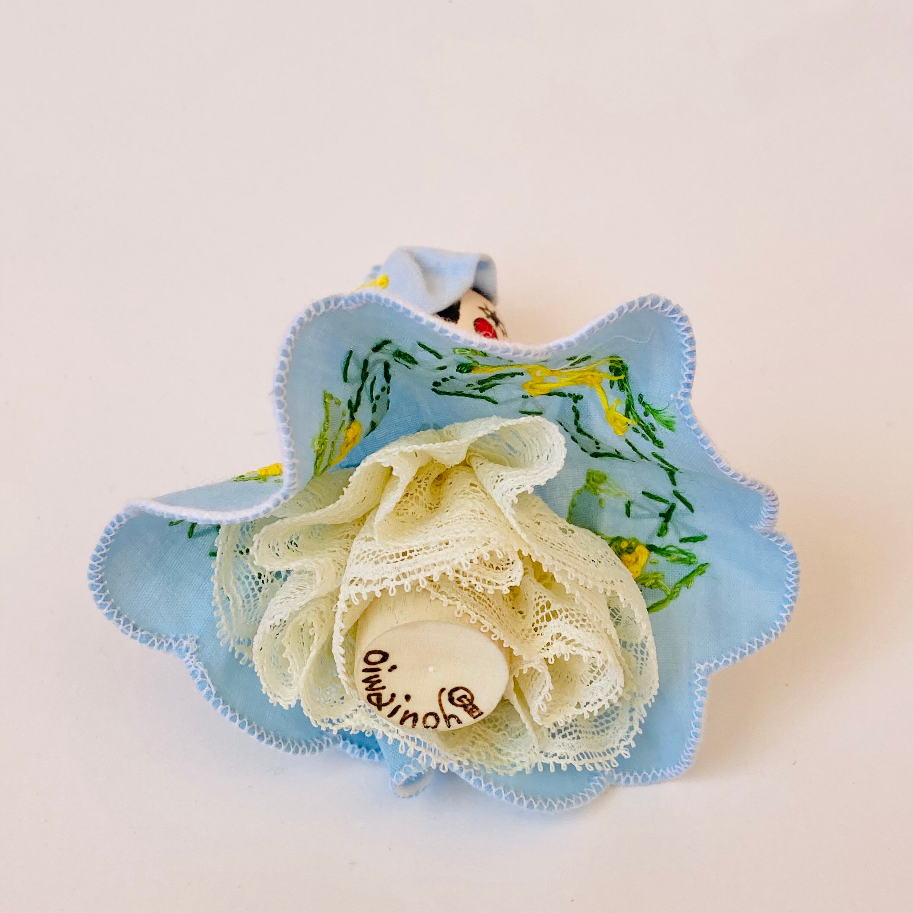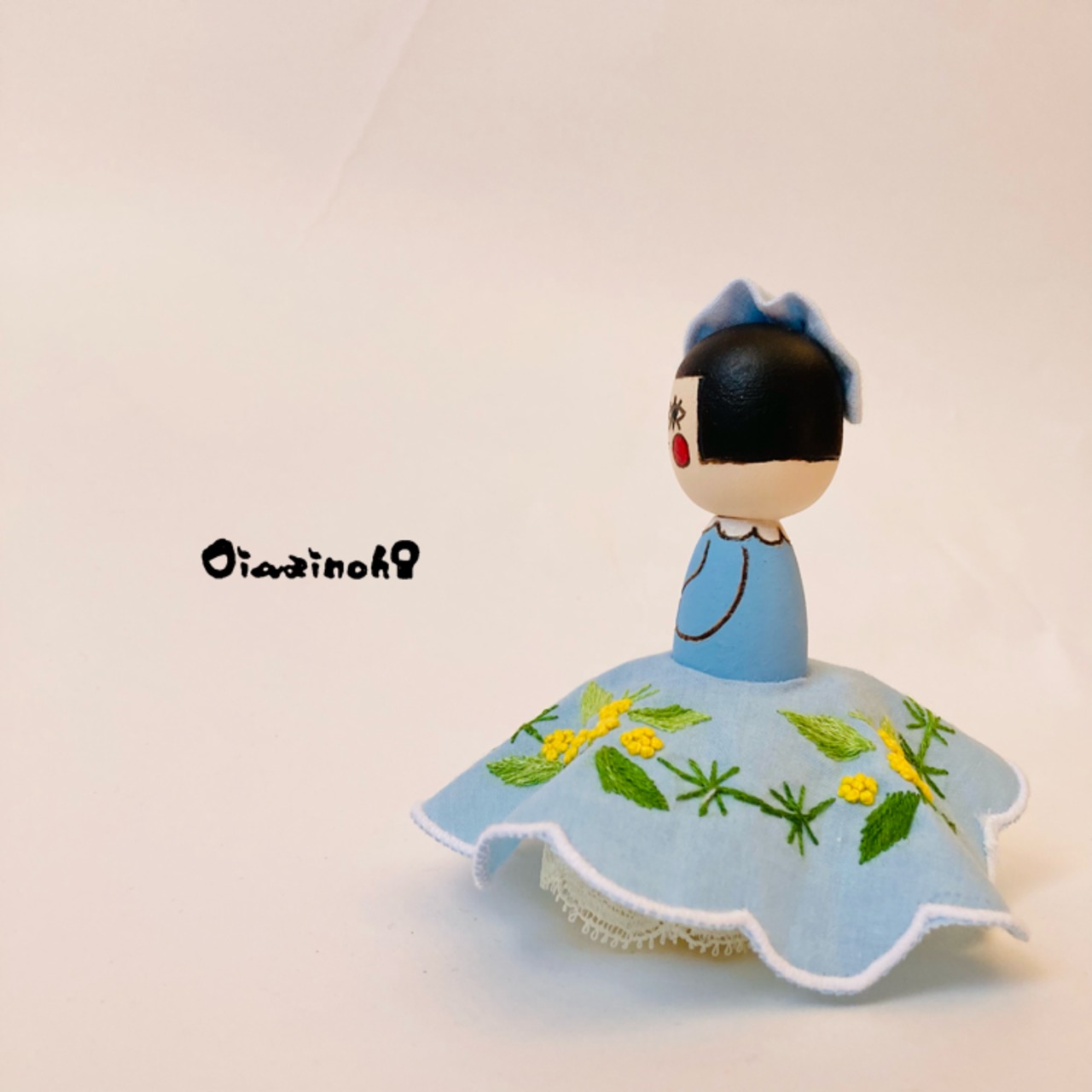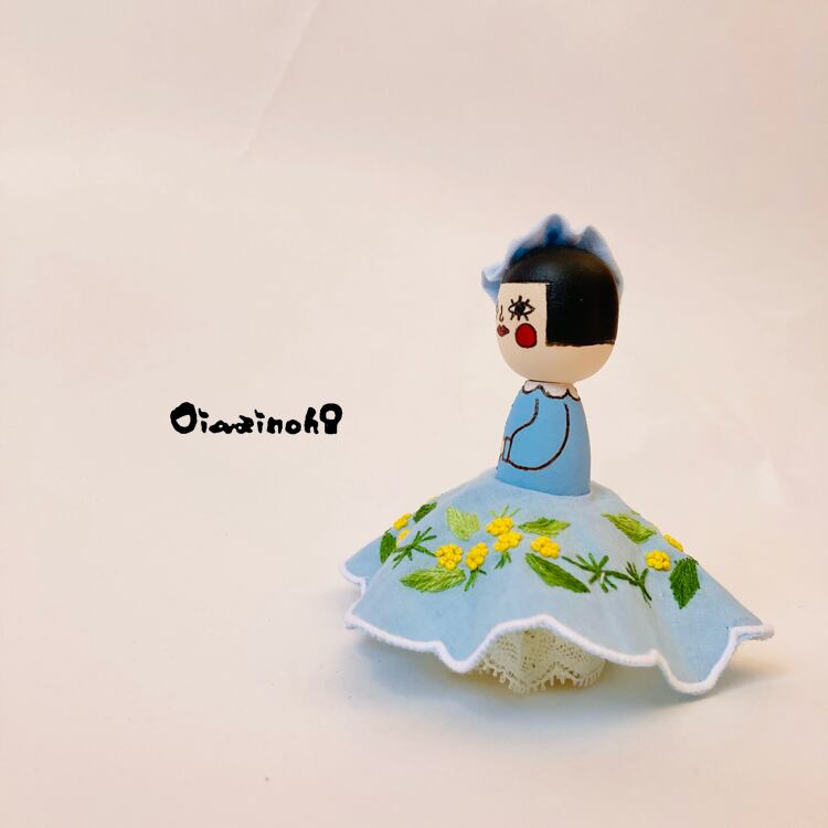 This little Kokeshi daughter is a spring-colored princess in an embroidered dress with a lovely mimosa motif.