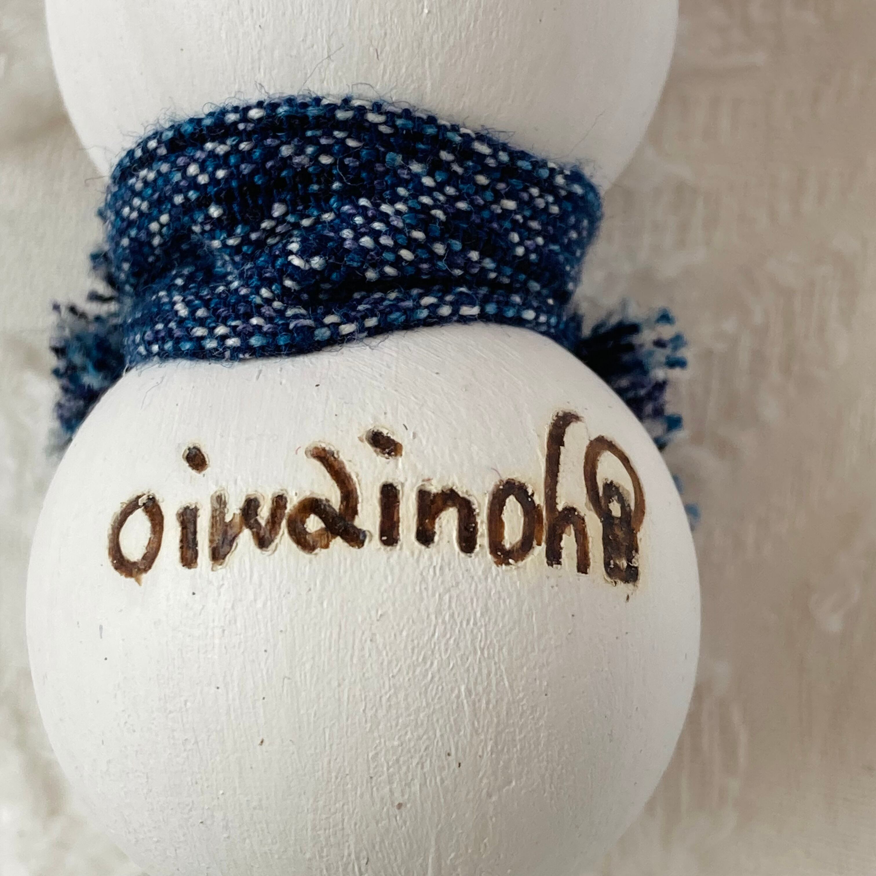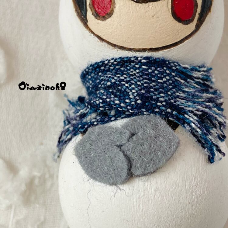 シックな木綿の端切れから作られたマフラーを巻き、フェルトの手袋を付けたこけ雪だるまさん。
