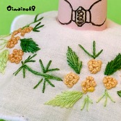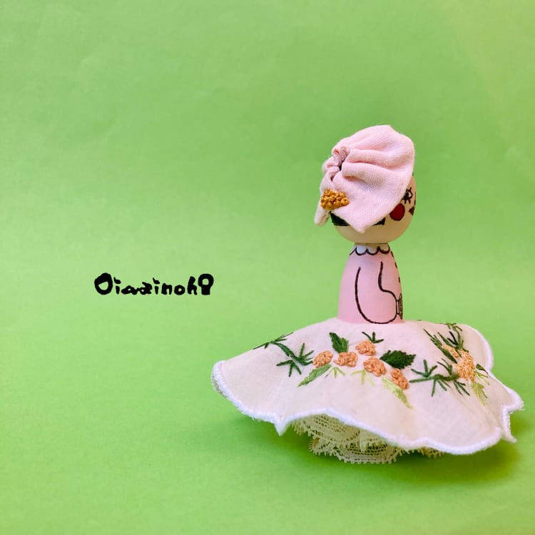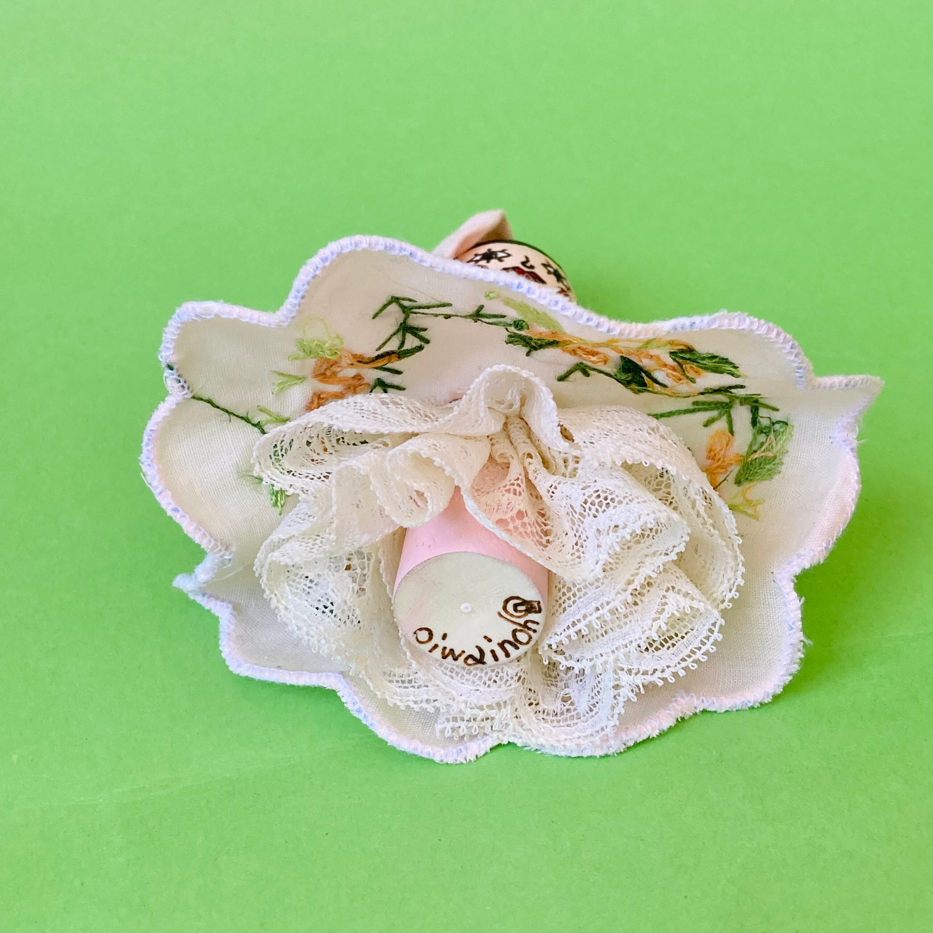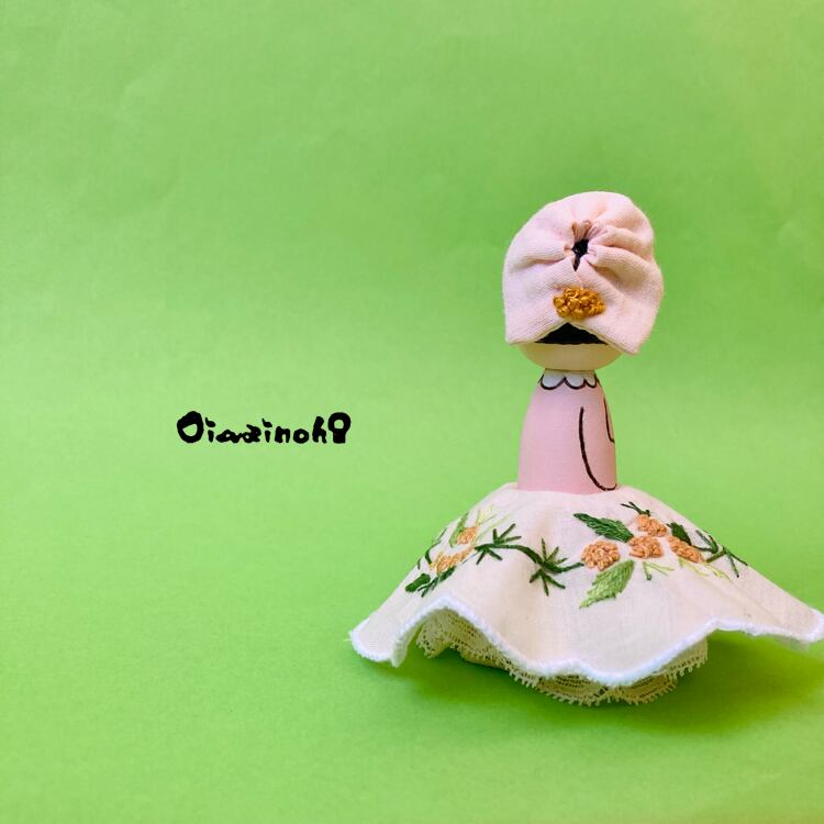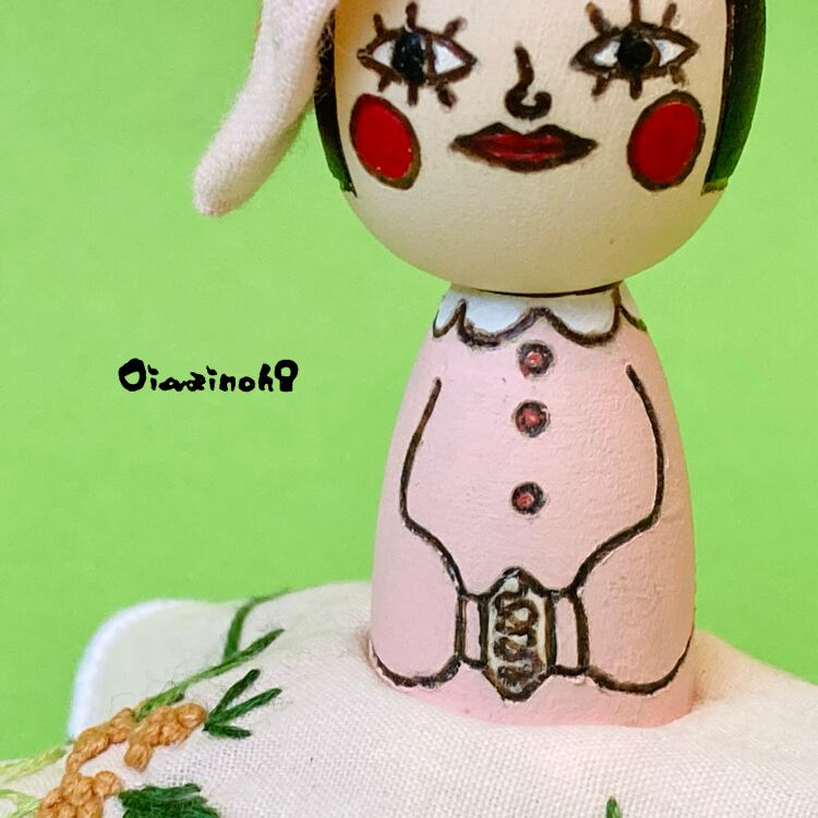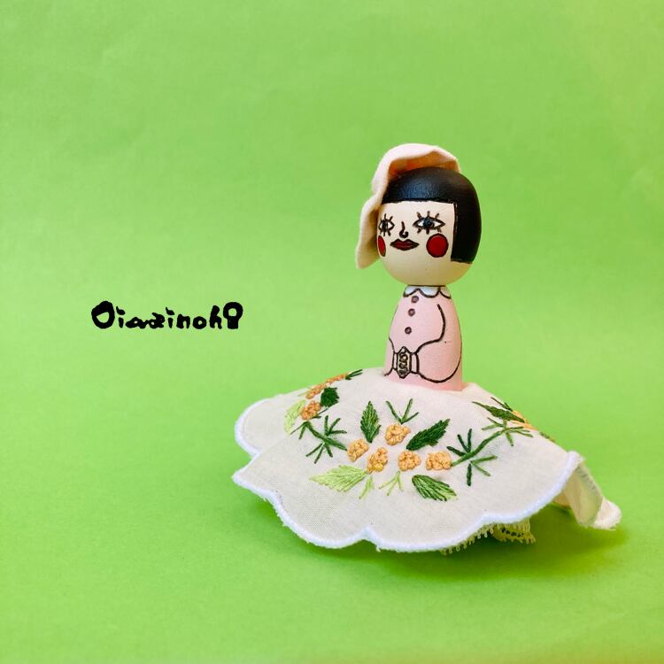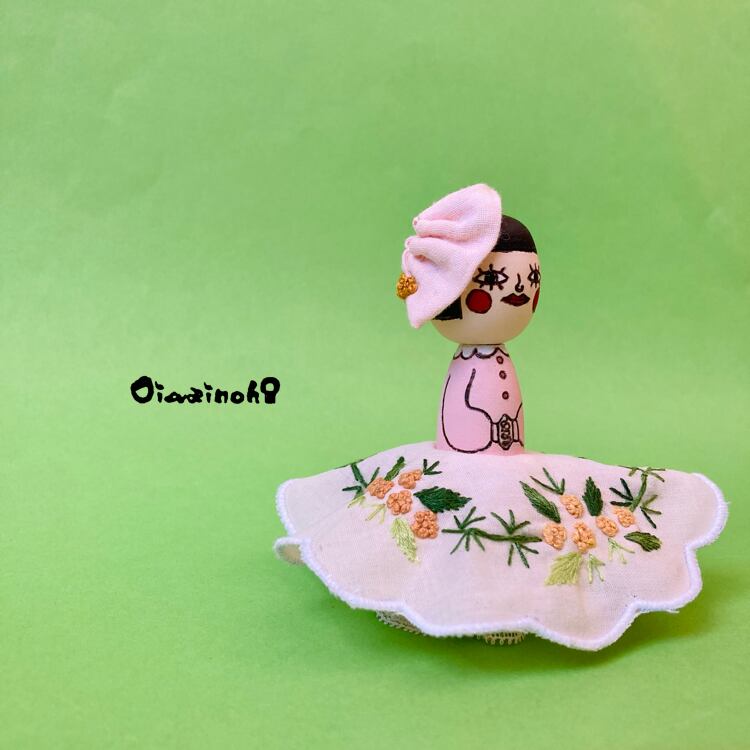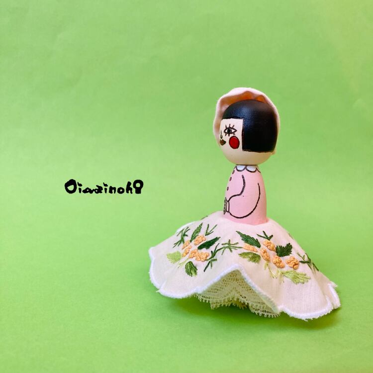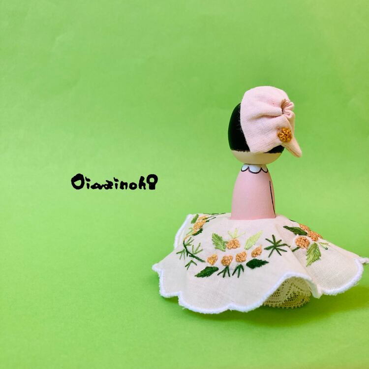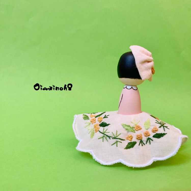 This little Kokeshi daughter is a spring-colored princess in an embroidered dress with a lovely mimosa motif.