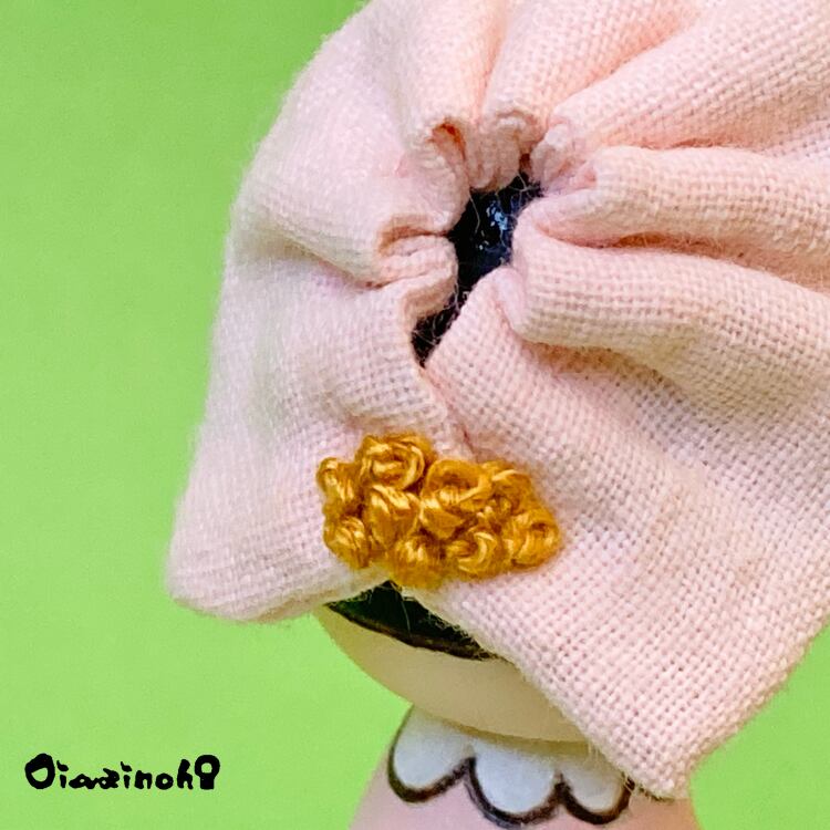 このちびっこけし娘さんは、可愛らしいミモザの刺繍が施されたドレスをまとった、春色プリンセス。